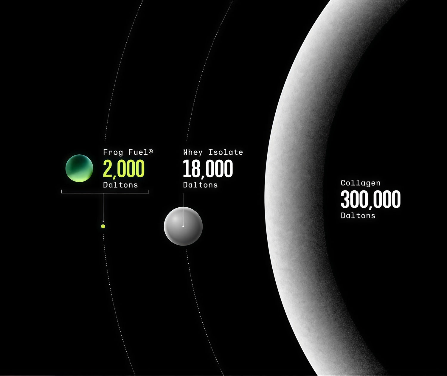- Nano-hydrolyzed for Maximum Absorption: Frog Fuel Collagen is broken down naturally with a fruit enzyme (not heat or acids like other products) to a molecular weight of 2000 - 5000 daltons. This allows certain peptide bonds in the protein to remain intact while also facilitating incredibly rapid digestion and absorption. Frog Fuel is proven to digest 4x faster than other protein supplements.